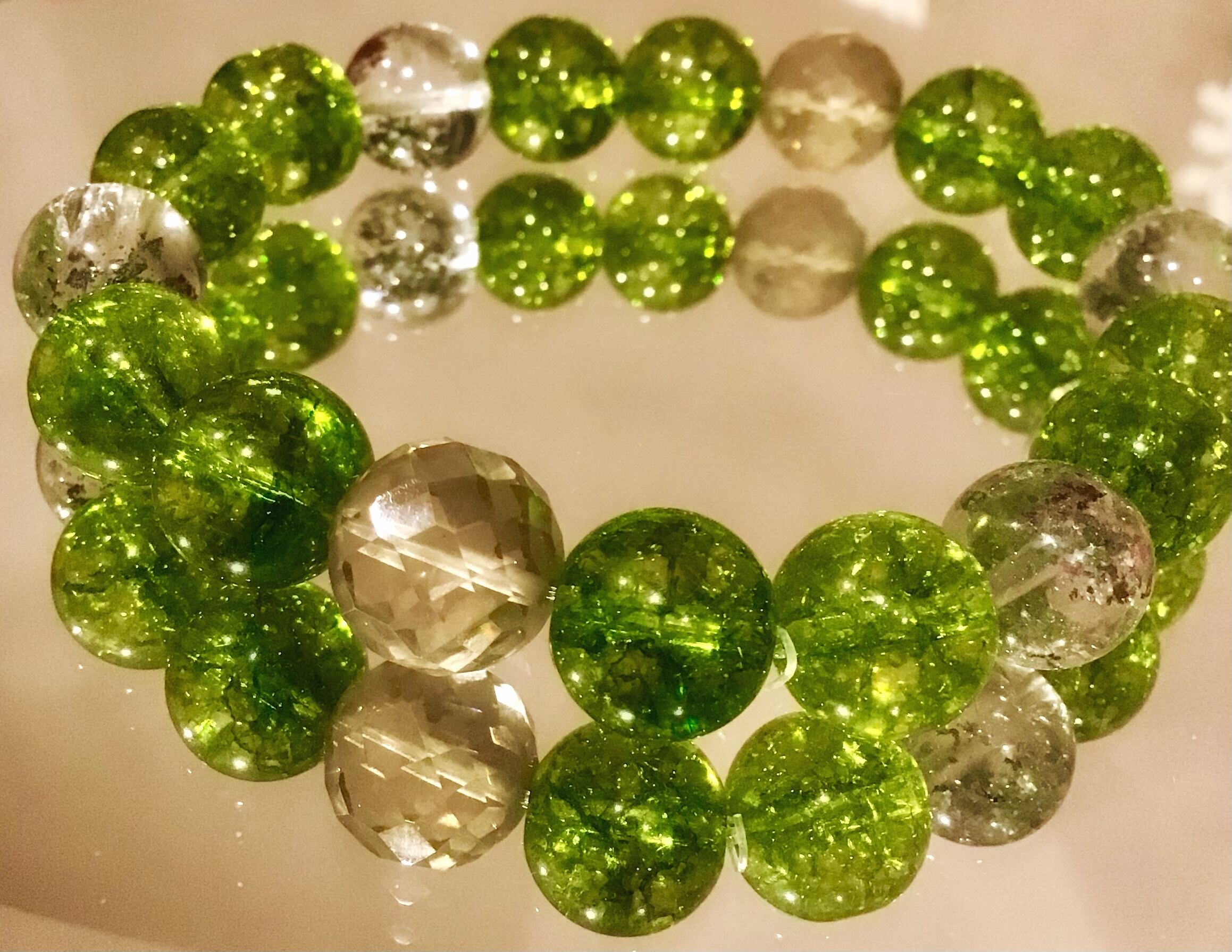 ペリドットが古い概念と、過去からもつ重荷を解放させ、新しい方向性へのエネルギーサポートとなります。導きを得るための高次の自分自身のエネルギーと繋ぎ、古い波動、は新しい波動に変えます。自分の運命と霊的理解を助け、自信を高め穏やかな自己主張を促進、成長の動機付けをおこない、必要な変化を促します。もっと喜びも豊かさも受け取りの許可をして良いよと、教えてくれます。古代より悪魔を寄せ付けない石としてオーラを保護します。意識を新しい意識にかえさせます。ガーデンクォーツは古くから中国では財運をもたらすとされてきました。邪気を取り払い、豊かさをもたらす為の、健康もサポートします。